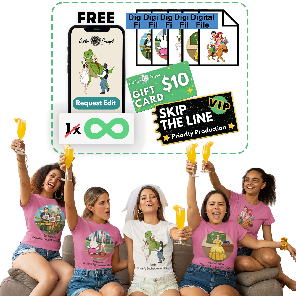 Five friends. Five custom shirts. One bachelorette weekend they’ll never stop laughing about.
